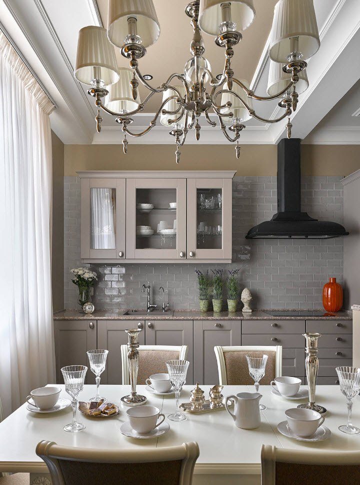 Если позволяет конфигурация кухни, лучше располагать стол вблизи от окна: чтобы днем естественный свет беспрепятственно поступал в зону в целом. Недостаток освещения в вечернее время можно восполнить потолочными люстрами. Они должны свисать непосредственно над столом, чтобы получилась равномерная акцентная подсветка.